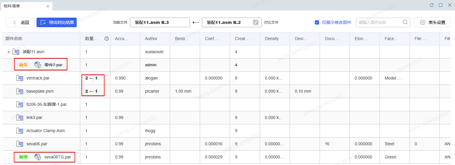 支持对两类装配体文件的物料清单(BOM)进行精准对比,快速定位部件调整差异: