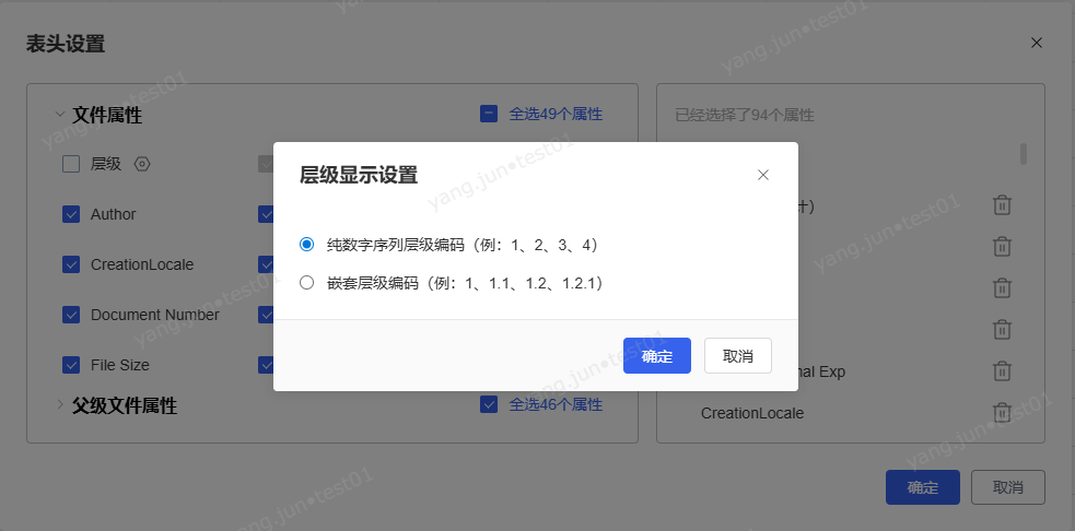 - 在表头设置对话框中,单击层级属性,可设置装配体层级编码规则。