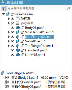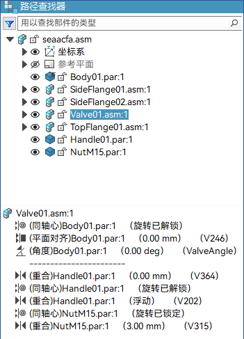在路径查找器的下部窗格中,各组关系之间经常会显示虚线。虚线上方的关系应用于路径查找器上部窗格中所选零件上面的零件。虚线下方的关系应用于位于路径查找器上部窗格中所选零件下方的零件。可以编辑虚线上方和虚线下方的关系。例如,选择 Valve01.asm 时,虚线上方的关系应用于 Body01.par,该零件在路径查找器上部窗格中的 Valve01.asm 之上。虚线下方的关系应用于 Handle01.par 和 NutM15.par,两者均在路径查找器上部窗格中的 Valve01.asm 之下。