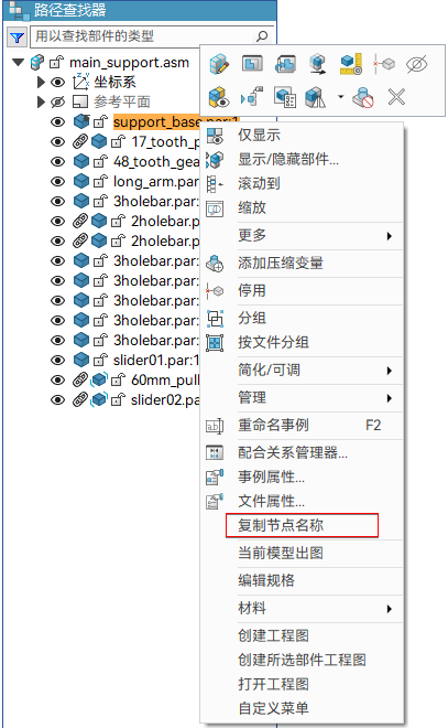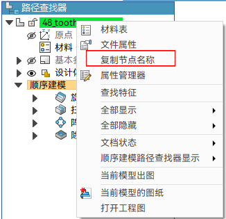 此命令仅复制节点名称,不复制后缀和文档名(对于装配体,可以在路径查找器显示文档名。文档名显示在 [ ] 中)。