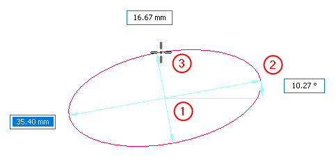 通过中心和点画椭圆 前提条件: 已进入2D草图环境或工程图环境。 操作步骤: 从功能区,选择主页/草图选项卡→绘图组→中心和点画圆列→中心点画椭圆命令。 先在合适的位置单击以定义椭圆的中心①,然后在位置②单击以定义椭圆的主轴长度和旋转角度,最后在位置③单击以定义椭圆的从轴长度。 Tip: 主轴可以比从轴短。 除了通过单击来定义椭圆的轴和旋转角度之外,还可以在椭圆命令条上键入值。也可以使用图形与命令条输入相结合的办法。 智能草图放置关系手柄。 您可以使用椭圆命令条上的选项和快捷菜单中的命令来编辑椭圆。