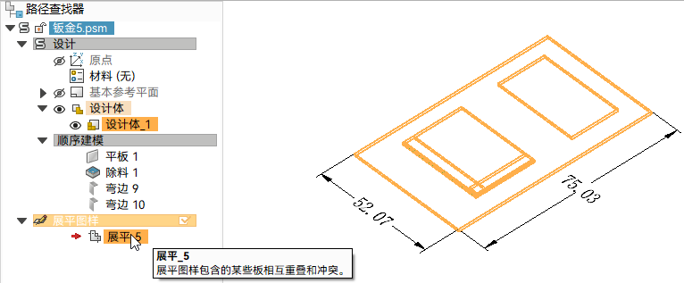 展平图样命令 展平图样命令 在同一个文档中将钣金件展平为设计模型。零件的展平版本与零件的模铸型版本相关联。 可以使用选项对话框上的展平图样处理选项卡来控制展平图样的输出参数。例如,可以指定:创建展平图样时,成型零件中的任何 B 样条曲线都简化成直线和圆弧。跨众多折弯创建除料且使用模板字体字符时可以创建 B 样条曲线。 Note: 当您使用此命令来构造展平图样时,天工云CAD 在路径查找器中放置一个展平图样条目。 当展平失败时,应用程序会弹窗提示,同时展平体半透明显示。 可以在路径查找器查看失败信息。