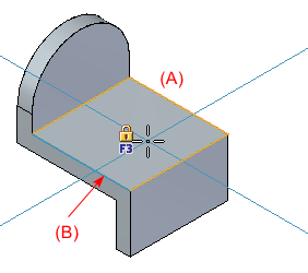 (A) 将高亮显示,且平面的边 (B) 也将高亮显示,以指示当前草图平面的 X 轴。从光标向外延伸的对齐直线自身也和光标下的平面对齐。图标