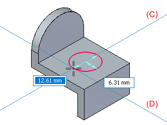 当您单击以定位草图元素的起点时,草图平面将自动锁定到高亮显示的平面或面。对齐线 (C) (D) 在您绘图时一直显示,以指示当前草图平面的 X 轴和 Y 轴。