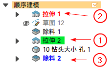 显示选定特征①的父级②和子级③。可以在图形窗口或特征路径查找器中选择特征。使用父级特征和子级特征颜色在特征路径查找器中显示父级和子级。可以使用选项对话框上的颜色选项卡设置这些颜色。