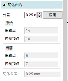 简化曲线 前提条件: 已进入2D草图环境或工程图环境。 操作步骤: 选中要减少编辑点和控制点数目的曲线。 在编辑定义命令条上,展开简化曲线组。 调整公差选项右边的上下箭头或输入公差值。当前编辑点和控制顶点的数量会随之改变。 单击应用按钮。