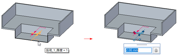 在顺序建模环境中动态编辑间隙或厚度值 操作步骤: 在路径查找器或图形窗口中选择一个压花特征,从关联工具条选择动态编辑命令。 单击间隙或厚度的尺寸以显示动态编辑框。 键入新尺寸后,按 Enter 键。 在图形窗口中的任意位置单击,以完成编辑。