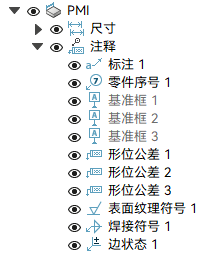 - 路径查找器上的 PMI集合包含活动文档中所有尺寸、注释和模型视图的可扩展子集。