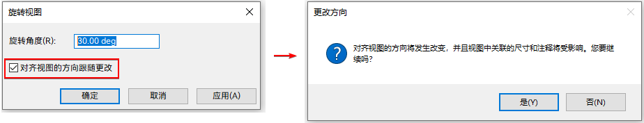 在旋转视图对话框中,勾选对齐视图的方向跟随更改复选框,可以同步旋转关联模型的所有2D图纸视图,确保所有对齐的视图方向同步变化。