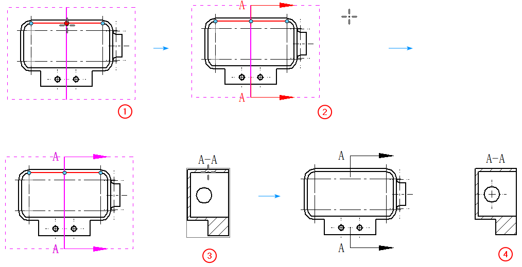 - 创建剖视图时,父视图可以是正交视图、向视图或局部放大视图。也可以是已有的剖视图。