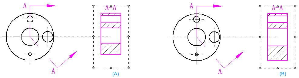 当剖切面由多个相交平面构成时,旋转剖面视图选项才可用。下图(A)是标准剖视图,被剖切的结构会直接向投影面进行法向投射;下图(B)是旋转剖视图,被剖切的结构会旋转到与投影面平行再进行投射。