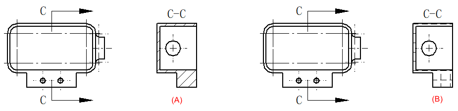 放置剖视图时,可以使用剖面视图命令条上的填充选项指定剖面的填充样式。放置剖视图时,还可以指定填充区的间距和角度。下图中的(A)和(B)是同一剖面视图使用不同填充样式时的情形。