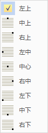 - 指定文本框上的锚点。默认文本框锚点位于左上方。有九个锚点可供选择,每个锚点指定框上自上而下以及水平到竖直的位置。