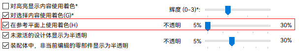 - 在原位激活零件或子装配时,将其他零部件(非当前编辑的零部件)显示为半透明状态。使用右侧的滑块可以调整不透明程度。Note: