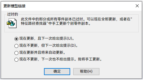 - 默认情况下,新创建的零件将保持与源文件的链接。当源文件中的设计体发生更改时,系统会在新零件打开时提示文件已过期,并提供更新选项。用户可以选择手动断开新零件与源文件之间的链接。
