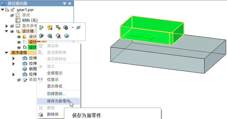 保存为新零件命令用于将选定的一个或多个设计体另存为全新的零件。