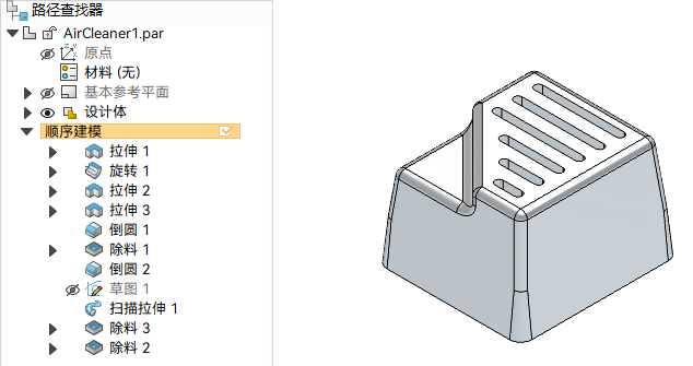 在顺序建模环境中,路径查找器选项卡以大纲格式显示实体零件的构成。可以使用路径查找器选项卡来选择零件特征以进行编辑和对零件特征重新排序。可以使用特征回放来运行特征构造的动画回放。使用由其他设计师构造的零件时,路径查找器和特征回放特别有用。