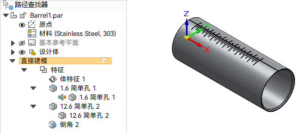 在直接建模环境中,路径查找器选项卡以大纲格式显示实体零件的构成。可以使用路径查找器来选择零件几何体以进行编辑和隐藏或显示几何体等。