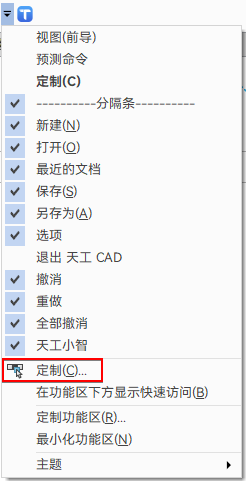 可使用从快速访问工具条访问的定制命令,调整提供的 天工云CAD 主题的布局。显示定制对话框后,可以通过更改布局选项卡中的选项来更改主题。