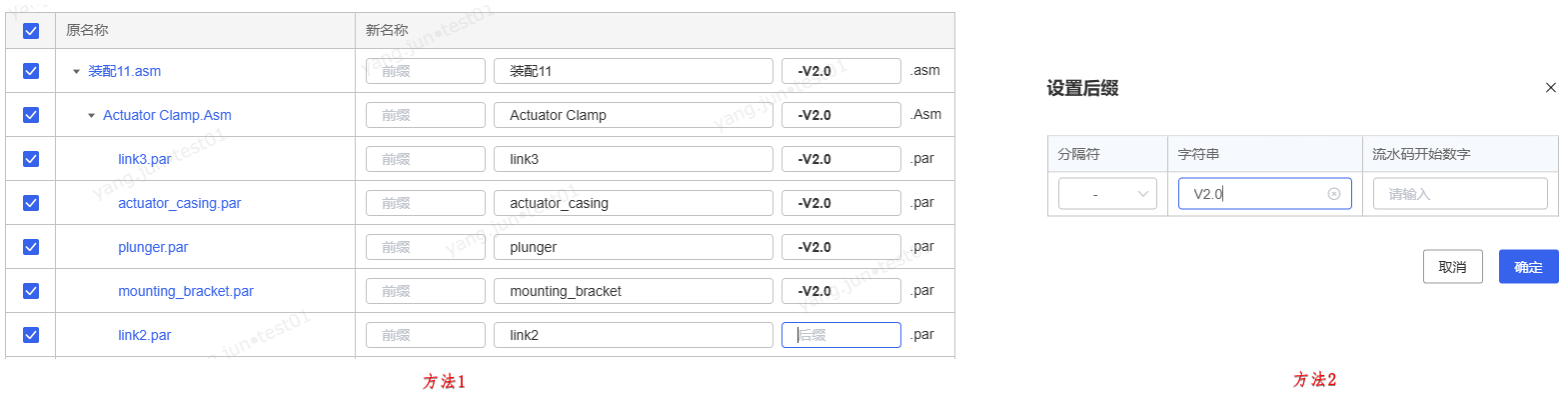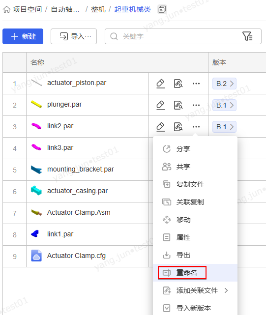 对个人空间、项目空间、部门空间中的单个零件(.par)、钣金(.psm)、装配体文件(.asm)执行重命名操作。支持直接添加前缀(如 “TG2025 - 零件 1.par”)、后缀(如 “零件 1-V2.0.par”)、以及通过属性组合(如 “材质 - 物料编码 - 零件名称.par”)进行重命名。