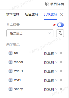 - 打开项目详情,在共享成员选项卡,单击X可删除共享成员。